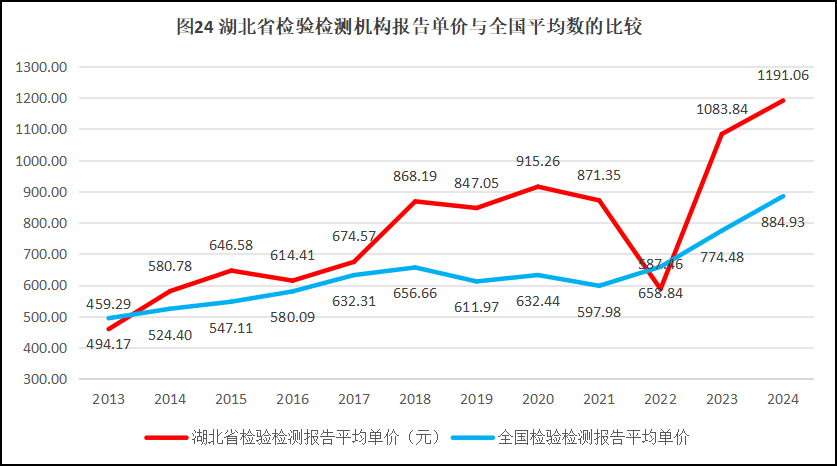 来看湖北省检验检测报告单价的情况,过去12年湖北省检验检测报告单价与全国情况的比较,如图24所示。