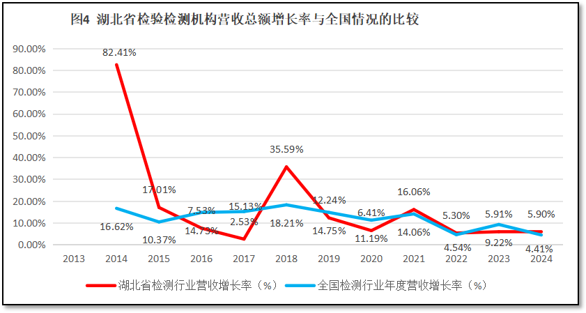 比较湖北省检验检测行业年度营收总额增长率与全国检验检测行业年度营收总额增长率随时间的变化,如图4所示。