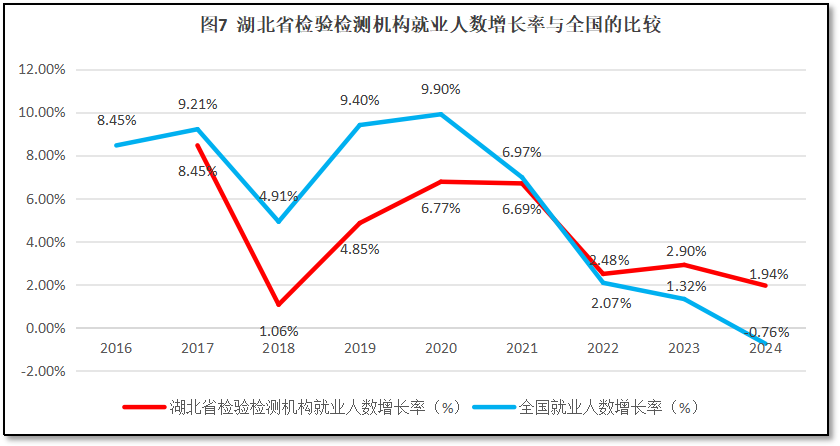 湖北省检验检测机构就业人数增长率与全国检验检测机构就业人数增长率的比较,如图7所示。